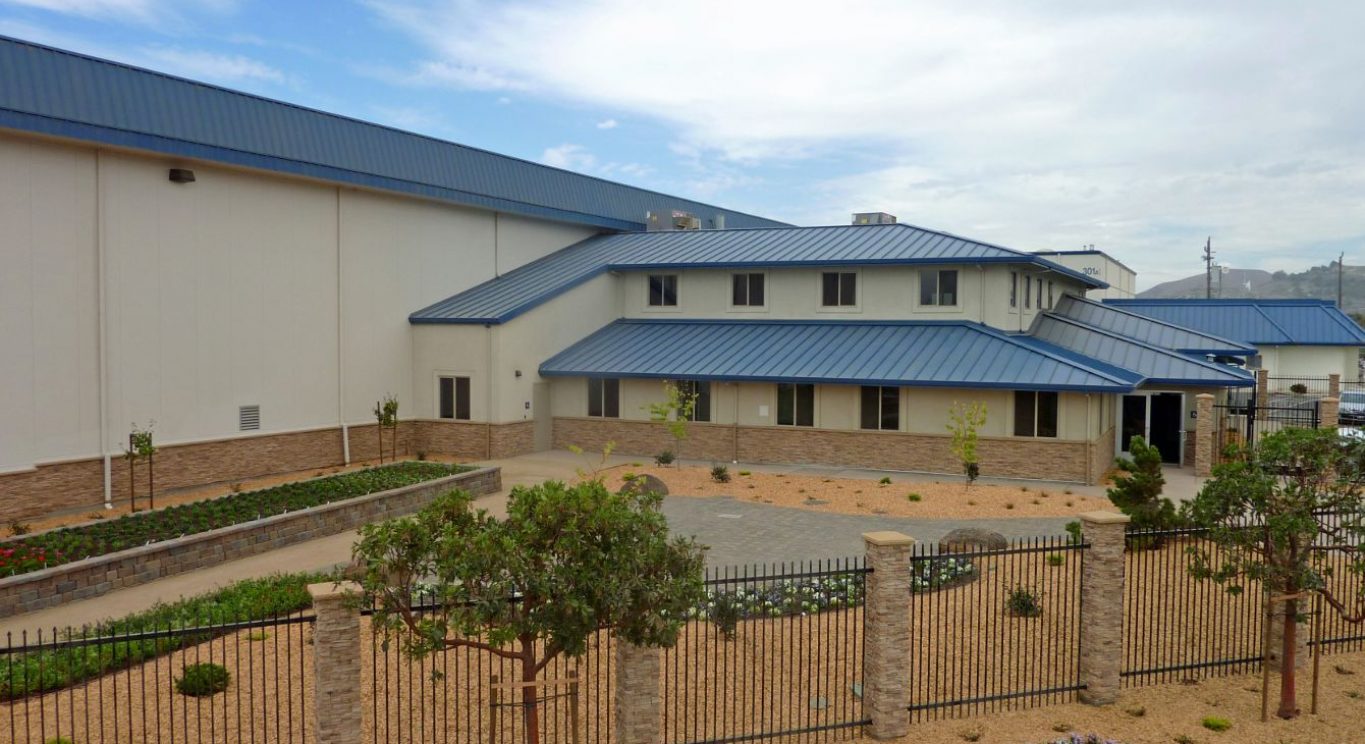 Metal warehouse/seed processing facility has a 2-story 10,687sf wood-framed office and a 3,993 sf metal canopy which connects the new facility to the existing 19,776 sf concrete tilt-up office/warehouse building. The warehouse utilizes energy-saving skylights with sensors to adjust the lighting based on the outside light. The walls and roof are insulated panels for temperature control.